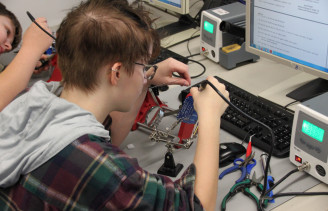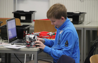 Im Modul 4 stand zunächst das Löten auf dem Plan. Denn im Vergleich zu den anderen Modulen, musste hier der Roboter erst von Grund auf zusammengebaut werden. Nachdem alle Teilnehmer dies erfolgreich gelöst haben, konnten sie ihren Roboter nun auch programmieren. Ihren Roboter konnten die Teilnehmer auch für weiteres Ausprobieren und Programmierungen nach Hause nehmen.