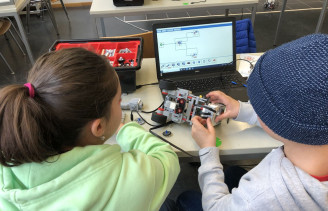 Viele TeilnehmerInnen waren begeistert von ihren vorherigen Teilnahmen bei Camps oder anderen Angeboten der TU und nahmen erneut teil. Für diese TeilnehmerInnen und diejenigen mit Vorerfahrung in der Informatik gab es den fortgeschrittenen Kurs, den Erweiterungskurs des Einsteigerkurses. In diesem Modul wurden die Strukturen der Informatik vertiefend wiederholt und EV3 Roboter gebaut und designt. Mit der graphischen Programmierung RINOLab konnten Linien verfolgt werden, Hindernisse aus dem Weg geschoben und durch den Raum bewegt werden.