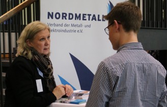 Abgeschlossen wurde der offizielle Teil von einer Podiumsdiskussion zwischen dem TUHH-Vizepräsidenten für Lehre Prof. Dr. Wolfgang Kersten, NORDMETALL-Geschäftsführer Peter Golinski, Head of Vocational Training bei Körber Technologies GmbH Silke Busch sowie den beiden dual Studierenden Amelie Steen (Maschinenbau/EXTRAKTA Strauss GmbH) und Lukas Thiesen (Maschinenbau/Airbus Operations GmbH). In diesem Gespräch wurden unter anderem die Themen demografische Entwicklung und sinkende Studierendenzahlen in den ingenieurwissenschaftlichen Fächern sowie die Möglichkeiten, diesen mit dem dualen Studium entgegenzuwirken. Fachkräftemangel und Digitalisierung sowie die damit verbundenen Anforderungen und Wünsche von Unternehmen und Universitäten – nicht zuletzt bezogen auf die zukünftige Gestaltung der Zusammenarbeit zwischen Forschung und Wirtschaft – aus unterschiedlichen Perspektiven beleuchtet. Auch das Thema Frauenquote wurde angesprochen – der Frauenanteil bei dual@TUHH ist, wie in den ingenieurwissenschaftlichen Fächern allgemein, eher gering. Amelie Steen sprach sich am Ende der Runde daher noch einmal deutlich dafür aus, den MINT-Bereich auch für Mädchen attraktiver zu machen, um mehr junge Frauen für die Ingenieurwissenschaften zu begeistern. Diese Aufgabe wird durch die Initiative robotik@TUHH mit besonderen Angeboten für Schülerinnen in MINT4Girls-Projekten wahrgenommen. NORDMETALL engagiert sich auch in diesem Projekt, dass in Kooperation mit dual@TUHH seit vielen Jahren unterschiedliche Kursformate zur Nachwuchsförderung anbietet.